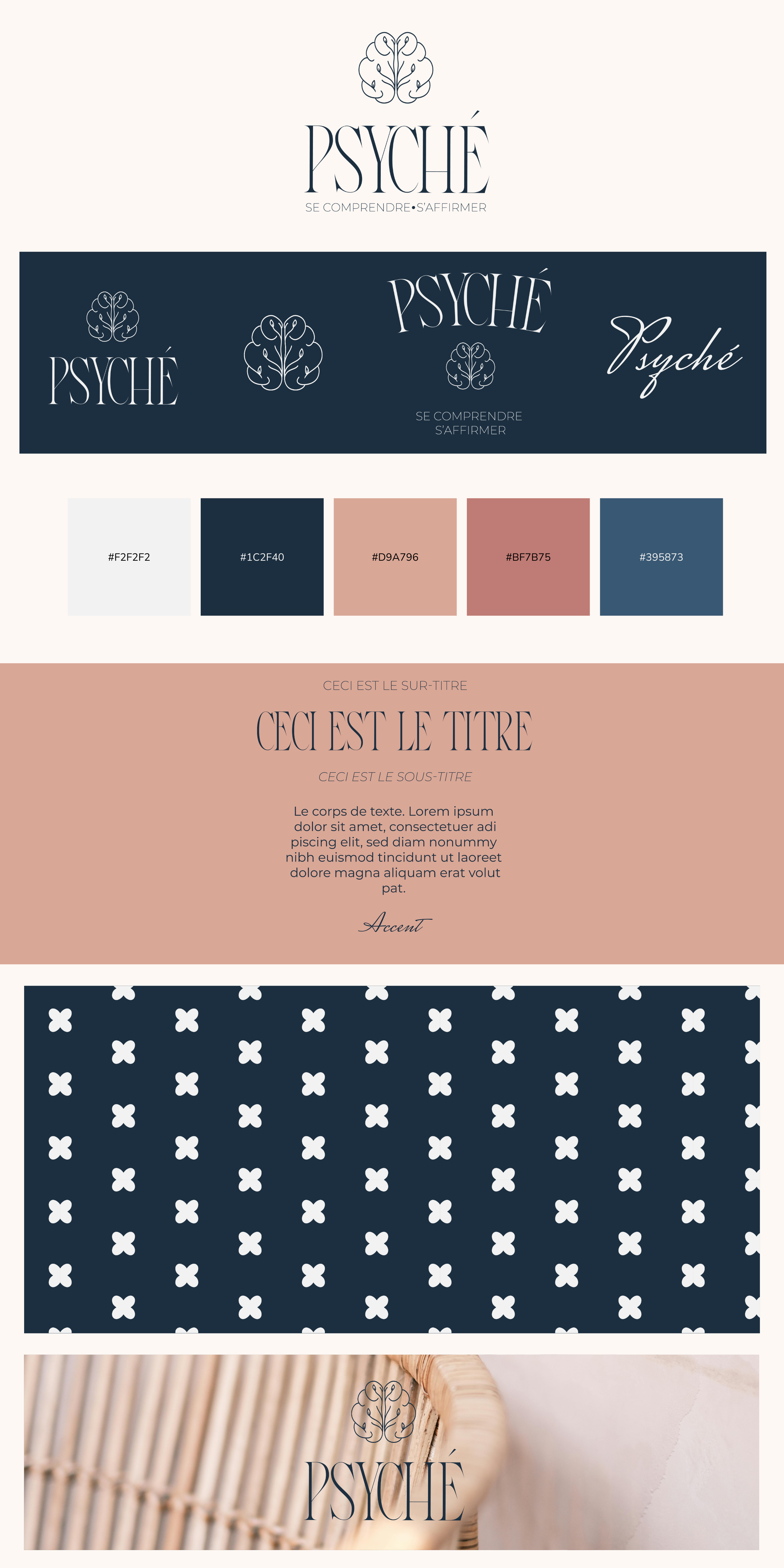 Psyché est une identité visuelle pré-désignée, pensée pour les psychologues, psychothérapeutes, coach qui souhaitent se démarquer avec élégance et cohérence.